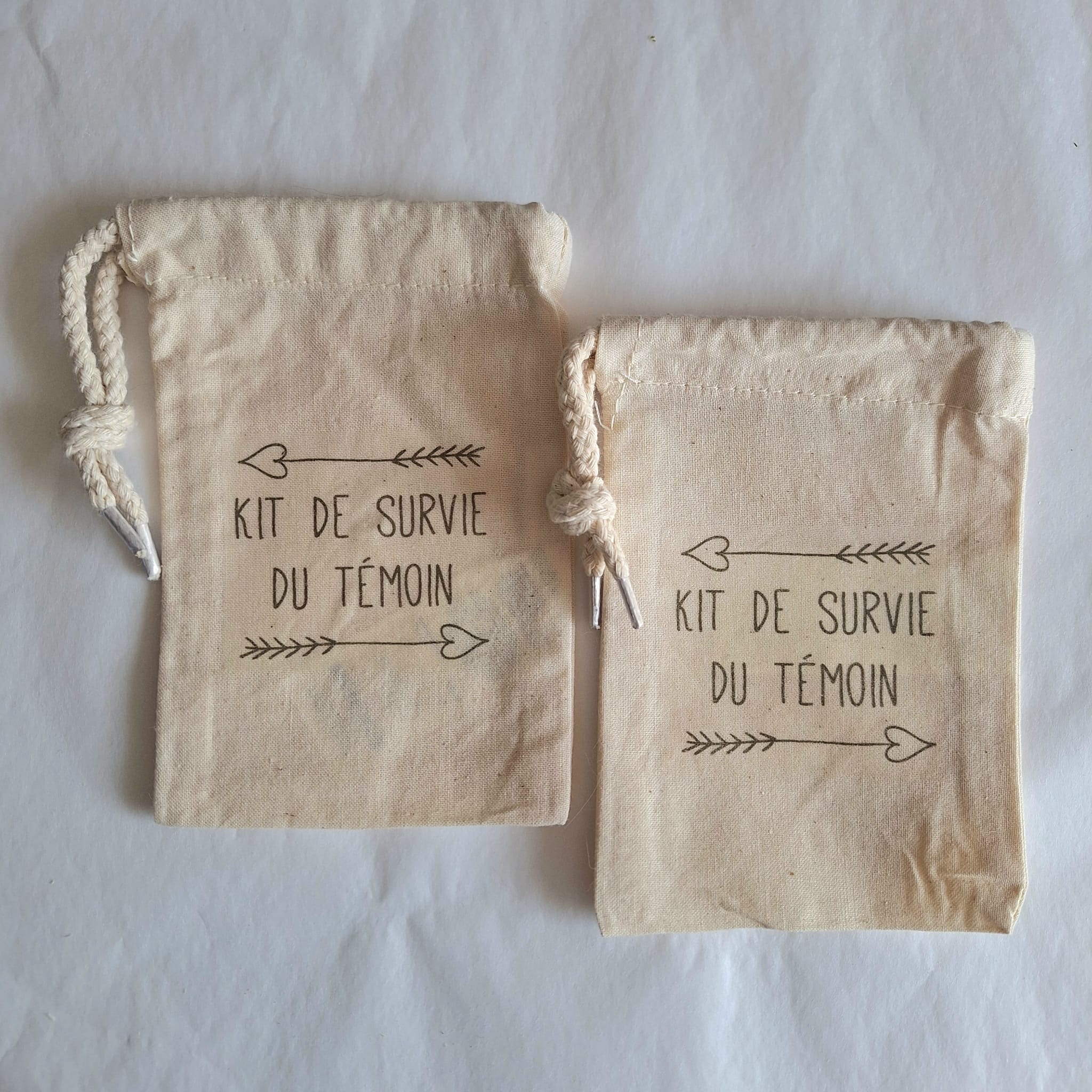 Lot de 2 pochons coton format 10 x 14 cm impression « Kit de survie du témoin ».