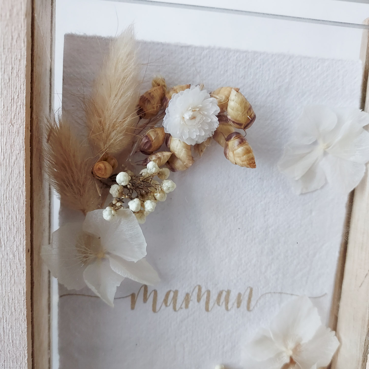 Ce cadre en bois brut naturel et non traité, plaira à une maman fan de déco et fleurs séchées.