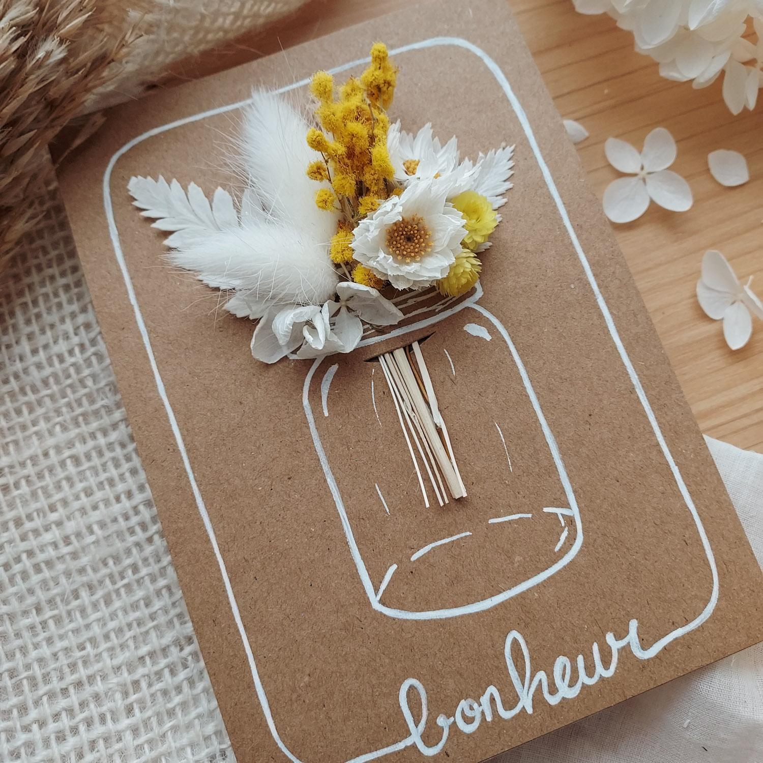 Chaque carte est faite main par mes soins, aussi des différences peuvent intervenir par rapport à la photo du produit et en fonction de l’arrivage de fleurs.