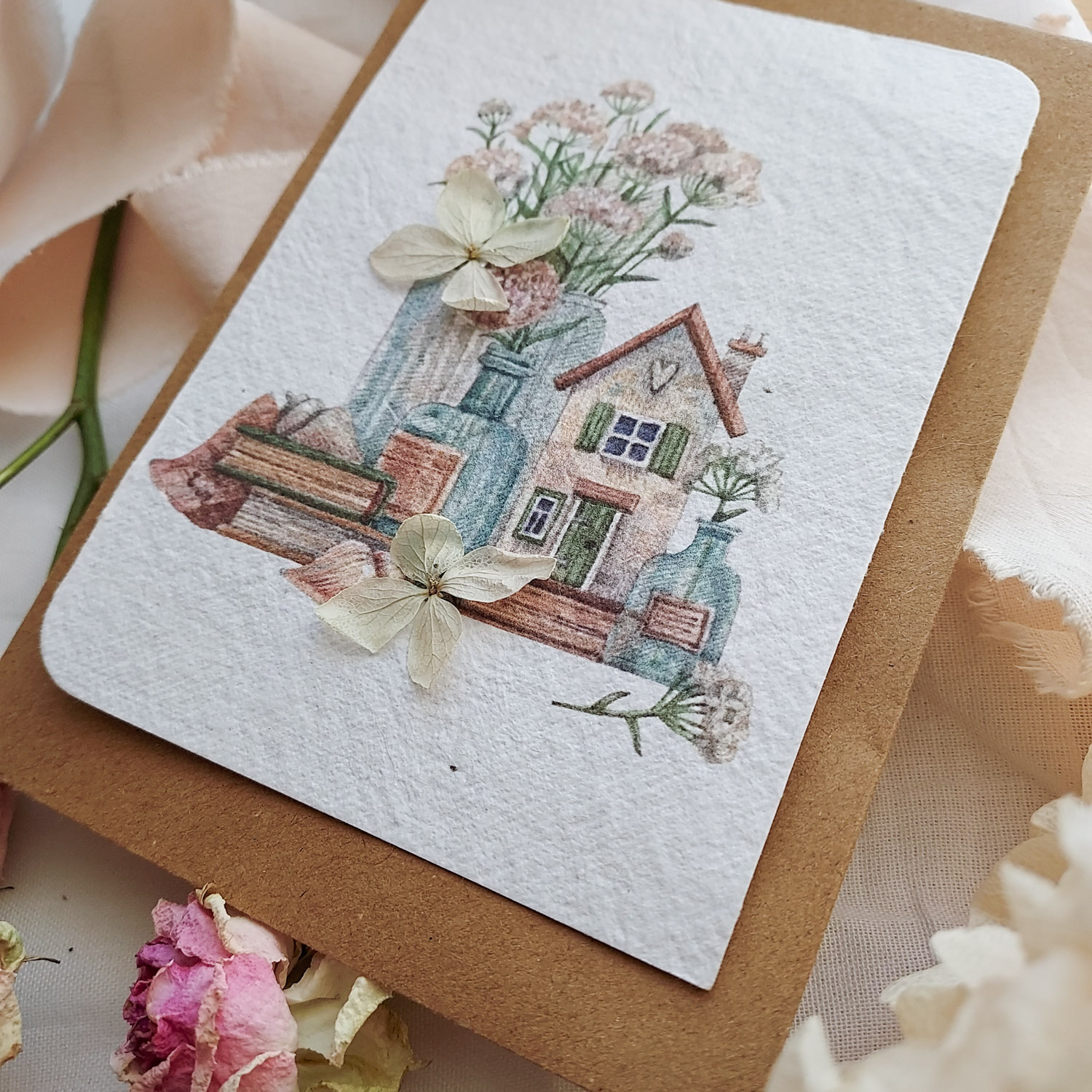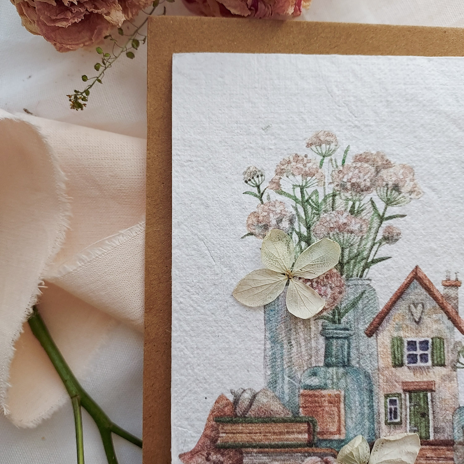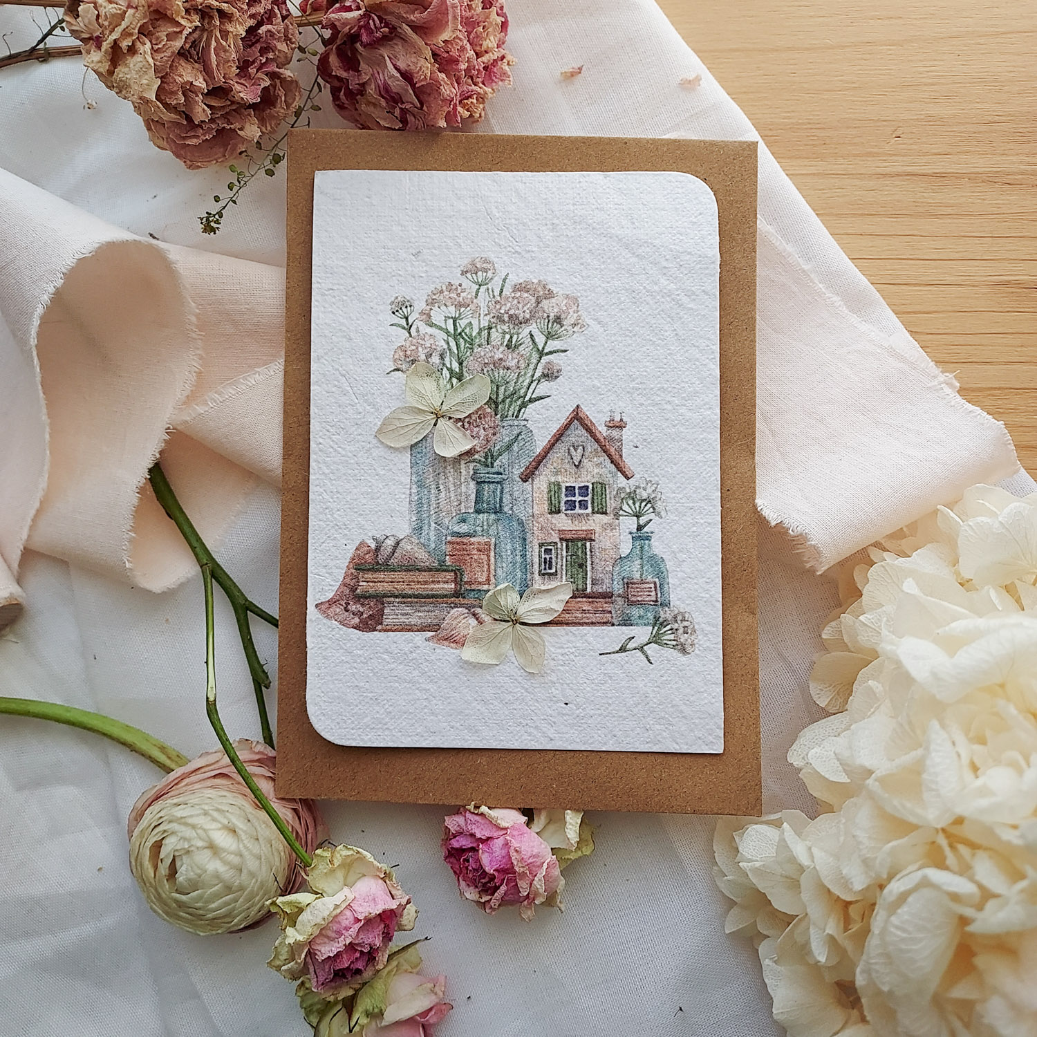 - Mini-maison et ses livres (agrémentée de fleurs d’hortensia séché).