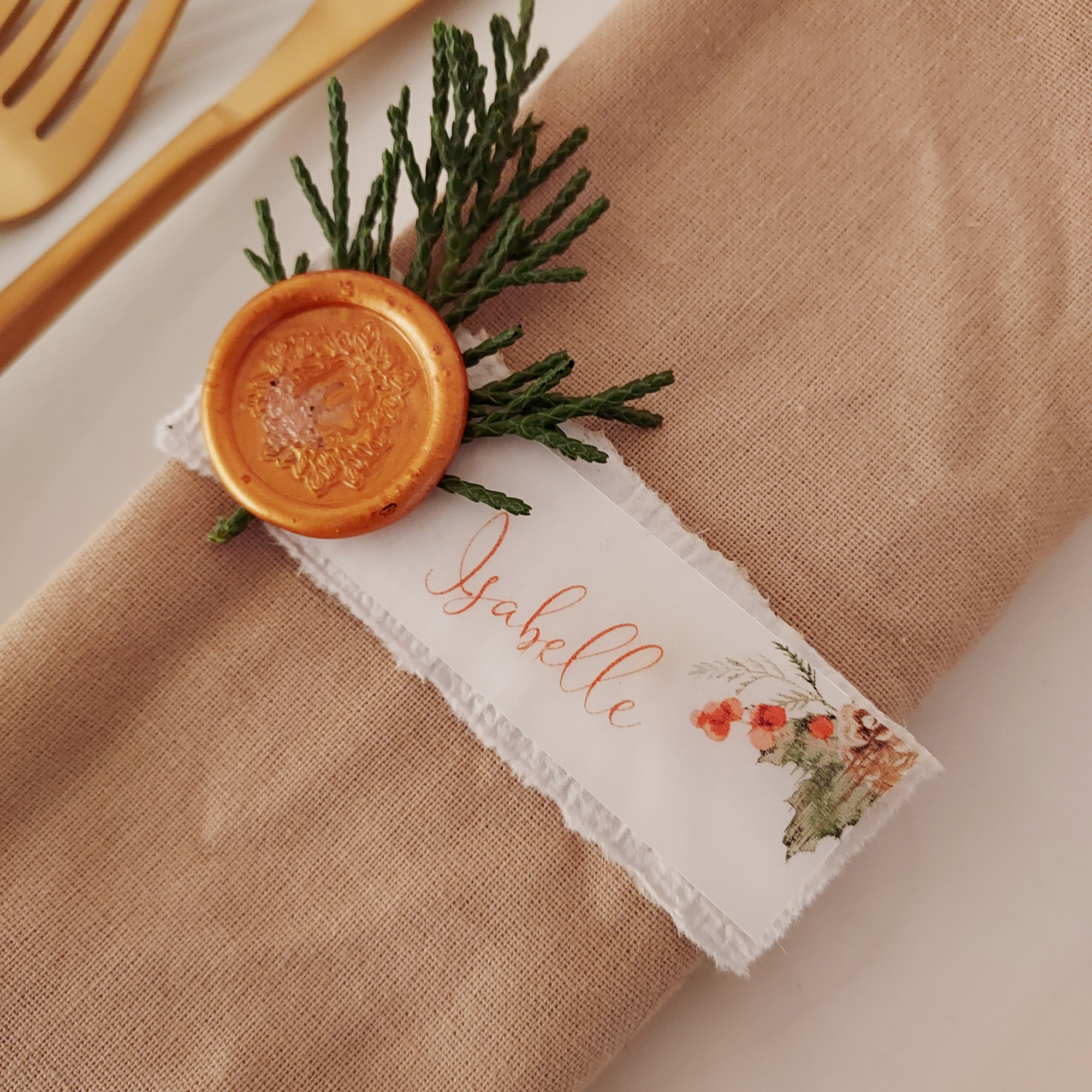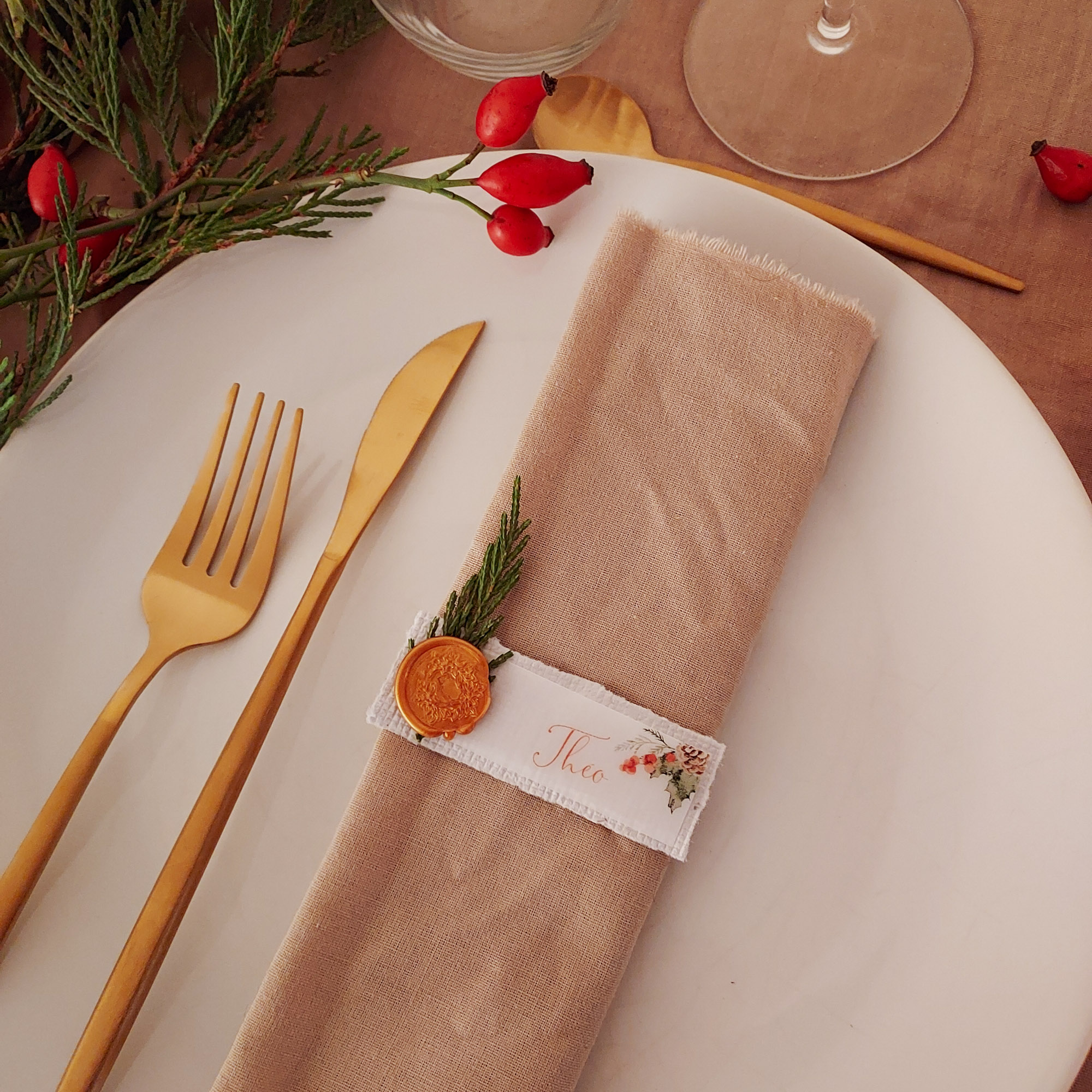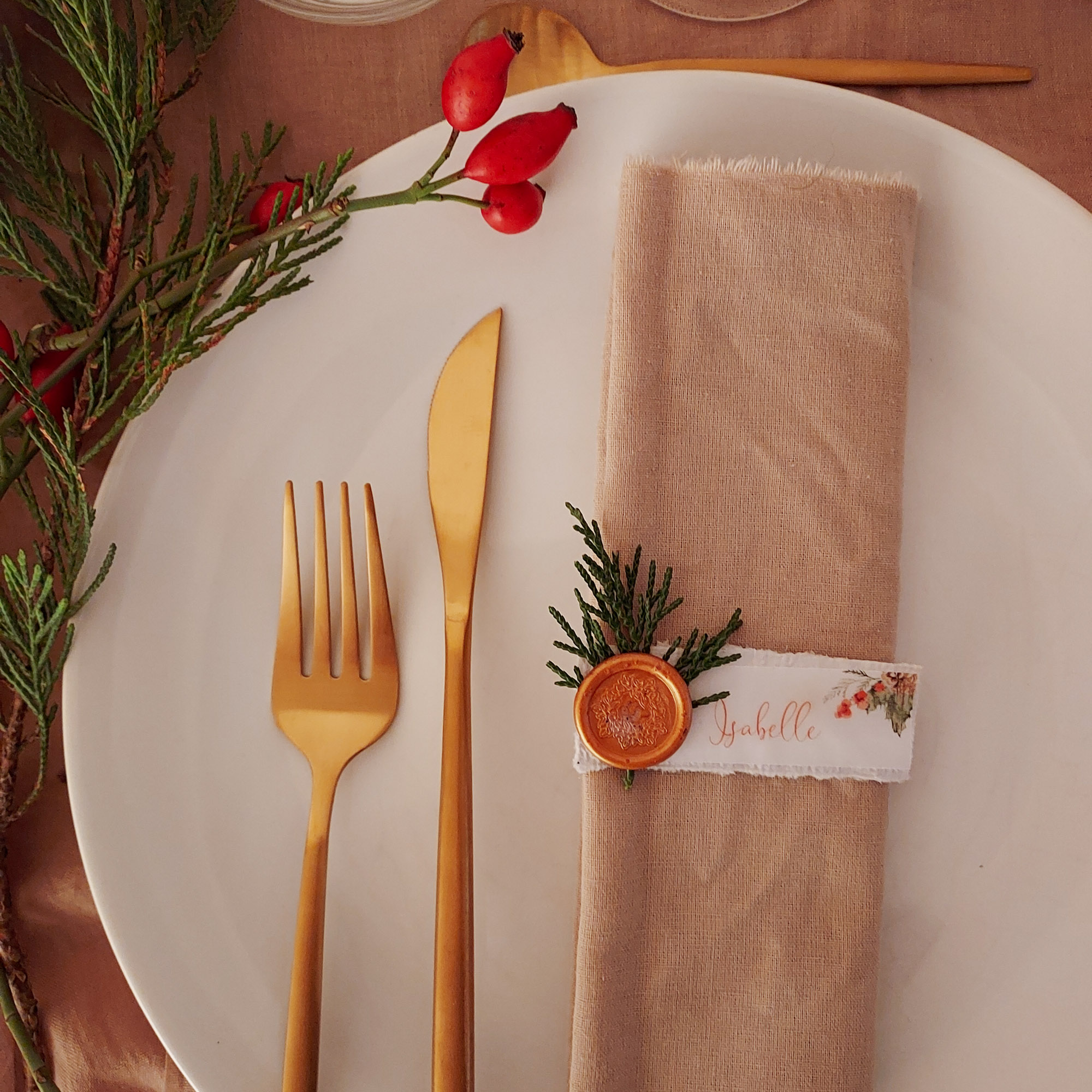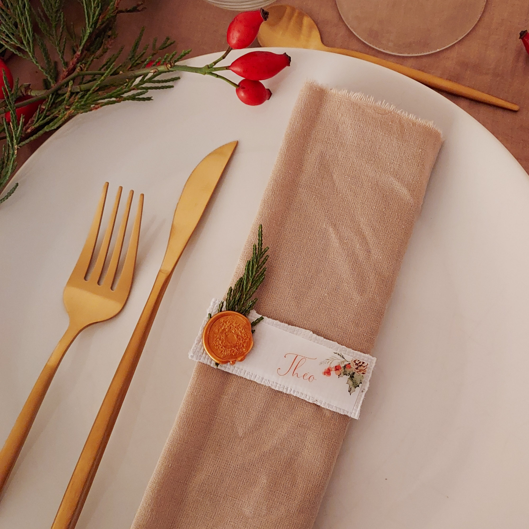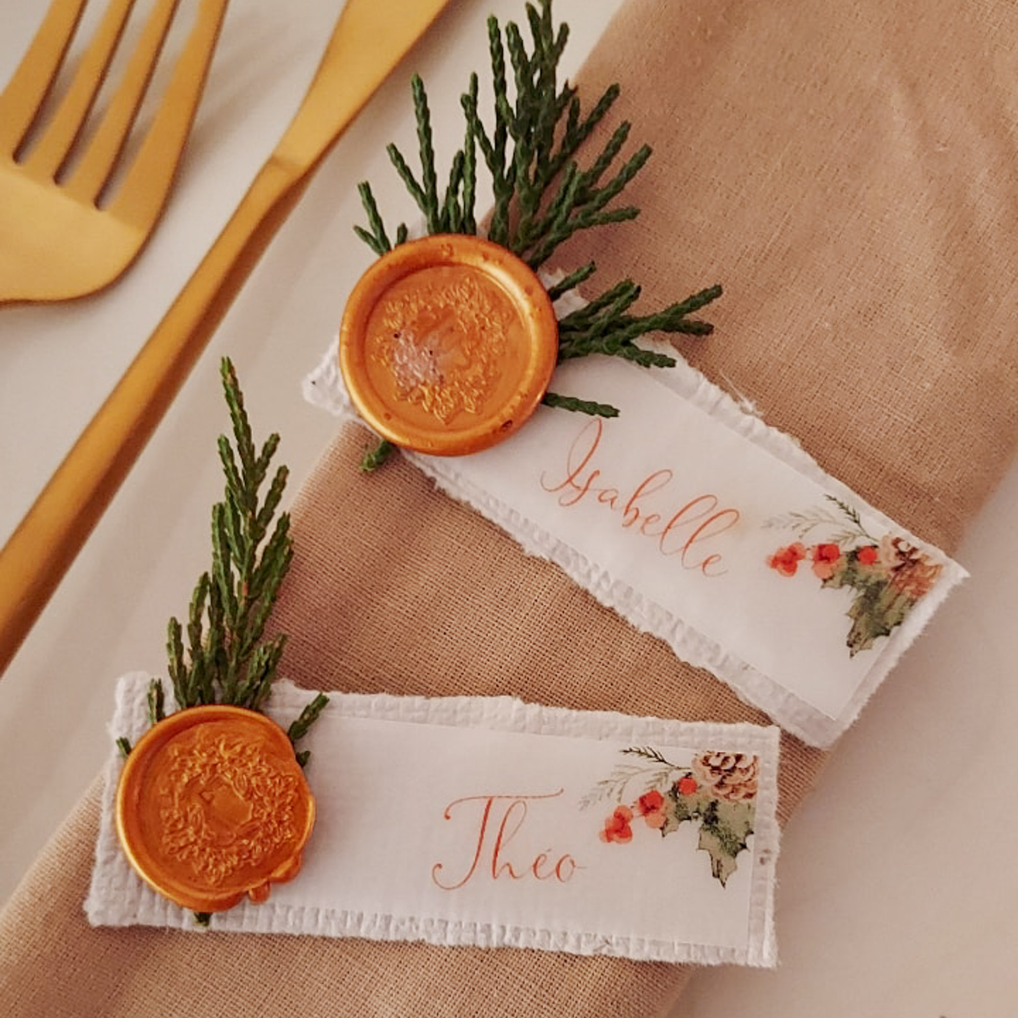 Dans les tons de blanc, vert, doré et rouge, les marque-places se marieront avec goût à vos décos de fêtes.