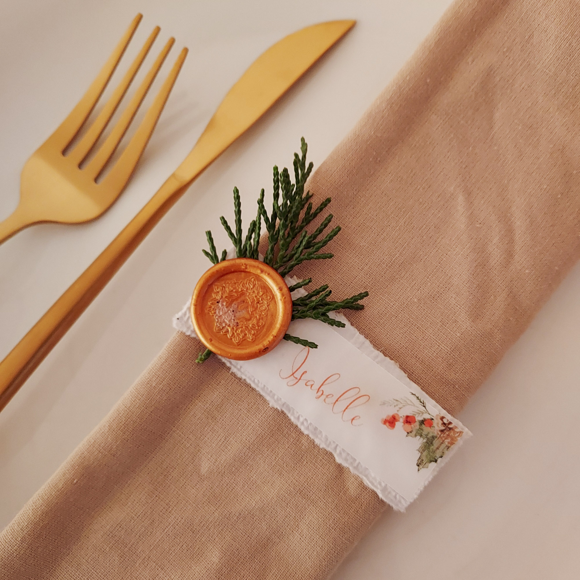 Original, elle est confectionnée dans mon atelier, imprimé sur papier calque et façonné sur mon papier recyclé, et décoré d’une petite branche de tuya et d’un seau de cire dorée.