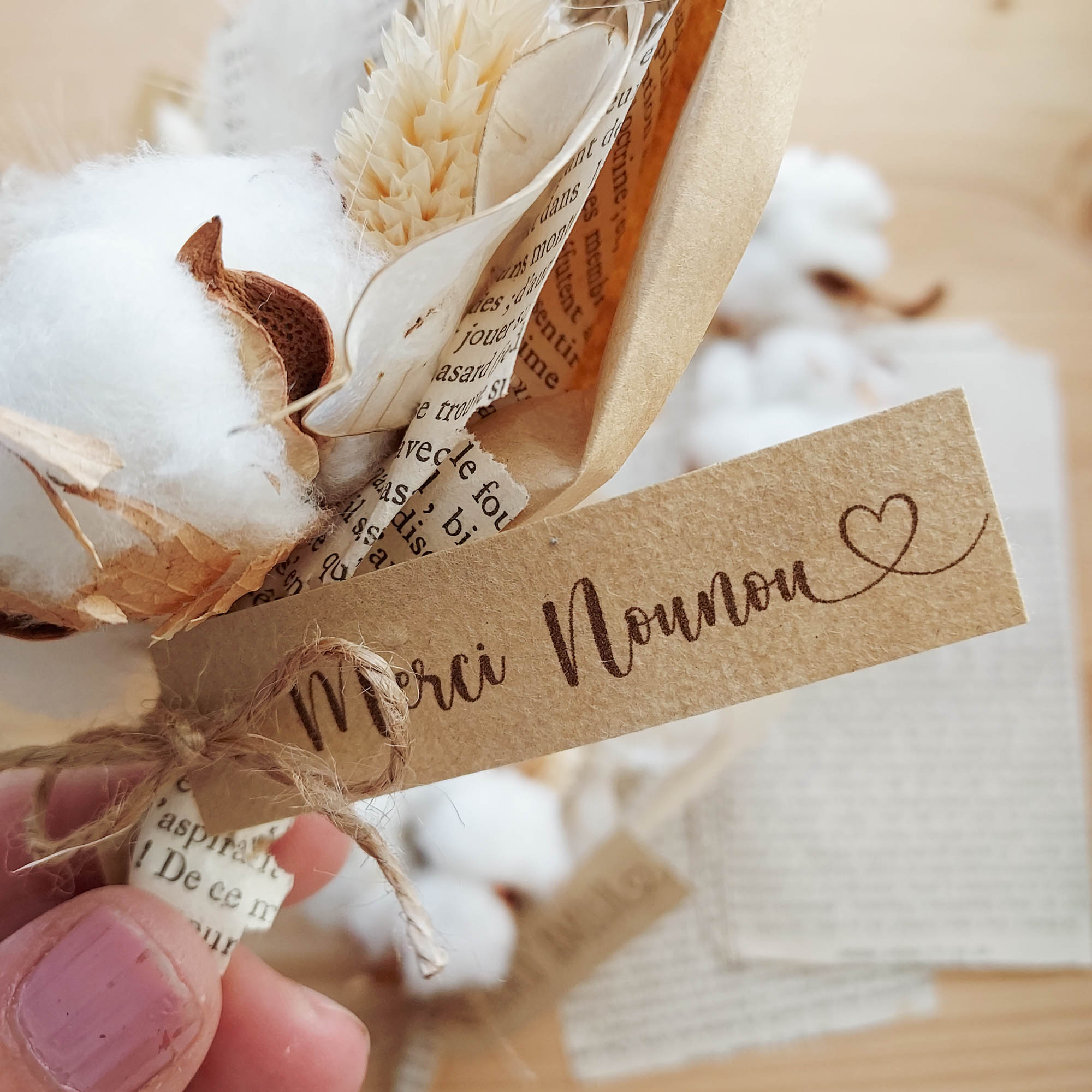 Petit bouquet de fleurs séchées à offrir pour la fin d’année. Quelques fleurs séchées entourées de kraft et de papier ancien, feuilles d’un vieux livre.