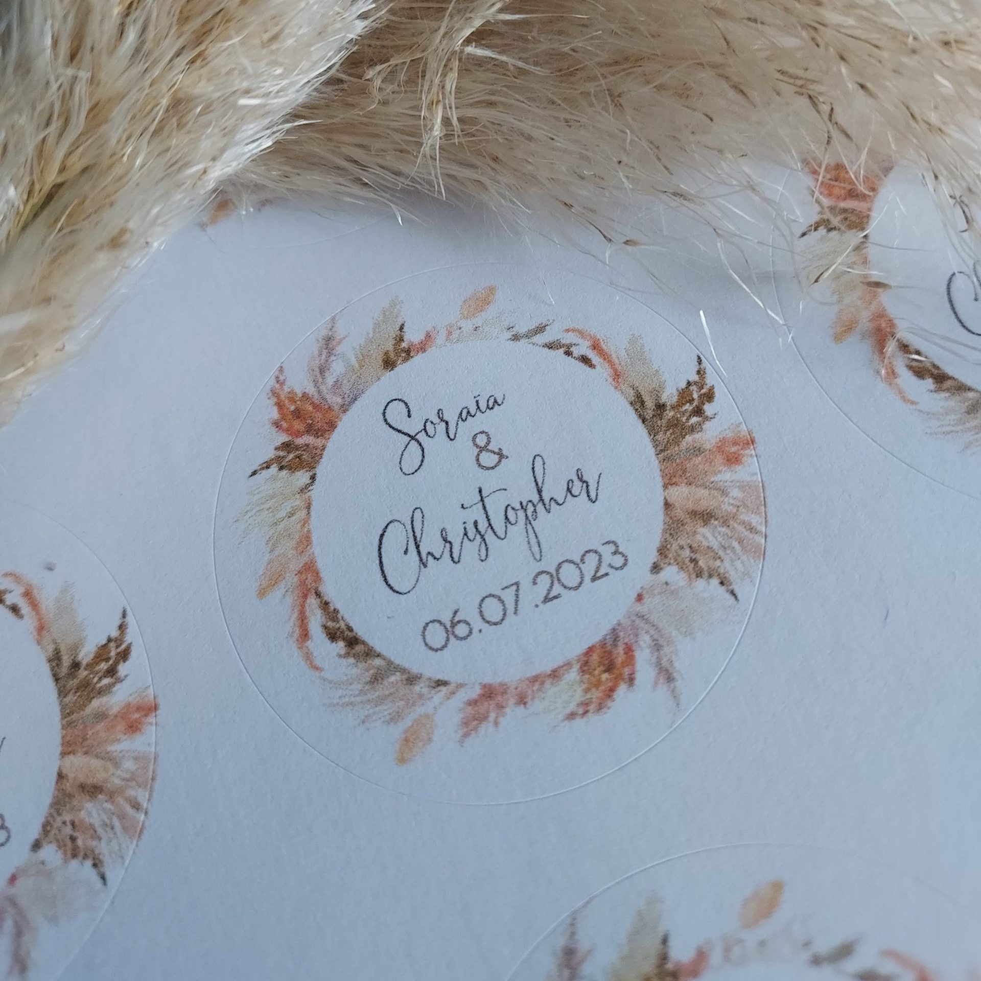 Jolies étiquettes autocollantes pour vos cadeaux invités, vos enveloppes de faire-part Mariage. Le thème Pampas terracotta est une valeur tendance.
